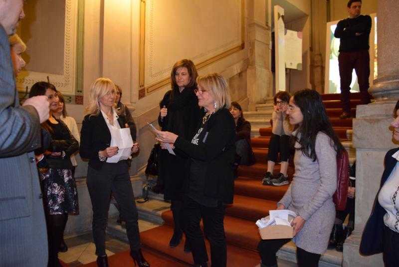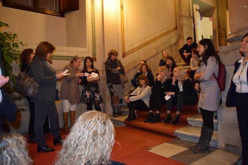 Un breve happening, ma molto sentito, che si è tenuto sulla scalinata dell'androne interno di Palazzo Cesaroni, dove a turno hanno letto poesie scritte da donne o che parlano della condizione femminile, dopo di che tutte hanno ripreso il lavoro. PG/