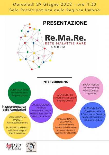 Re.Ma.Re. Umbria vuole “contribuire allo sviluppo di nuove competenze, conoscenze e professionalità tra il personale accademico, medico, paramedico e socio-assistenziale attraverso un potenziamento delle stesse e delle collaborazioni tra i vari professionisti. Vuole inoltre impegnarsi nella revisione delle tecnologie e metodologie utilizzate al fine di poter sensibilizzare ulteriormente la popolazione civile e le istituzioni rispetto alle problematiche quotidiane che vivono le PcMR e le loro famiglie”.