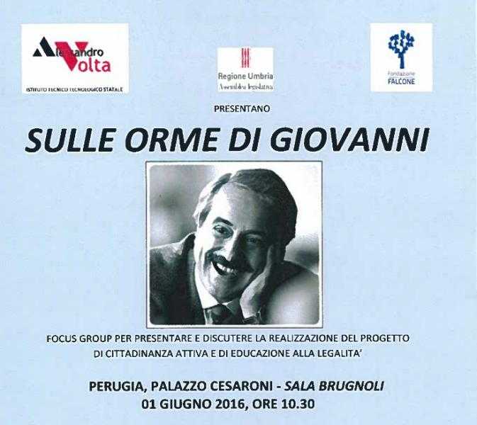 (Acs) Perugia, 28 maggio 2016 – Mercoledì 1 giugno, a Perugia, nella Sala Brugnoli di Palazzo Cesaroni, alle ore 10, 30, sarà presentato e discusso nel corso di un focus group il progetto di cittadinanza attiva e di educazione alla legalità “Sulle orme di Giovanni”, elaborato dall'Istituto tecnologico statale 'A. Volta' di Perugia ed ammesso al finanziamento del Miur.