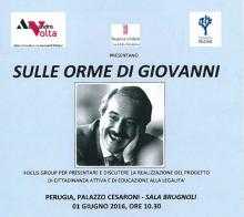 (Acs) Perugia, 31 maggio 2016 – Domani, mercoledì 1 giugno, a Perugia, nella Sala Brugnoli di Palazzo Cesaroni, alle ore 10,30, sarà presentato e discusso nel corso di un focus group il progetto di cittadinanza attiva e di educazione alla legalità “Sulle orme di Giovanni”, elaborato dall'Istituto tecnologico statale 'A. Volta' di Perugia ed ammesso al finanziamento del Miur.