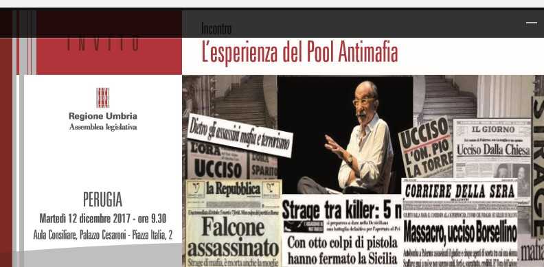 (Acs) Perugia, 7 dicembre 2017 - “L'esperienza del Pool Antimafia”: questo il tema di un incontro pubblico che si svolgerà martedì 12 dicembre a Perugia, nell'Aula dell'Assemblea legislativa dell'Umbria (Palazzo Cesaroni, Piazza Italia), alle ore 9.30. All'incontro, promosso e organizzato dalla Presidenza dell'Assemblea, partecipano la presidente Donatella PORZI; Giacomo LEONELLI, presidente della Commissione d'inchiesta “Analisi e studi su criminalità organizzata, infiltrazioni mafiose, tossicodipendenza, sicurezza e qualità della vita”; Fausto CARDELLA, Procuratore generale presso la Corte di Appello di Perugia; Giuseppe AYALA, vicepresidente della Fondazione Falcone.