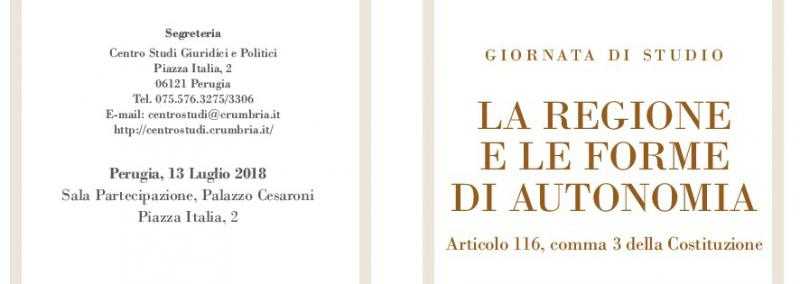 Seguiranno gli interventi di Luciano Vandelli (Università degli Studi di Bologna) “L’attuazione dell’art. 116, ultimo comma, della Costituzione: tra differenziazione, ipotesi del rilancio del regionalismo, valori unitari” e di Massimo Luciani (Università degli Studi di Roma La Sapienza) “L’Umbria e l’art. 116, comma 3 della Costituzione”. Coordinerà i lavori Marco Lucio Campiani (presidente del Centro Studi Giuridici e Politici).