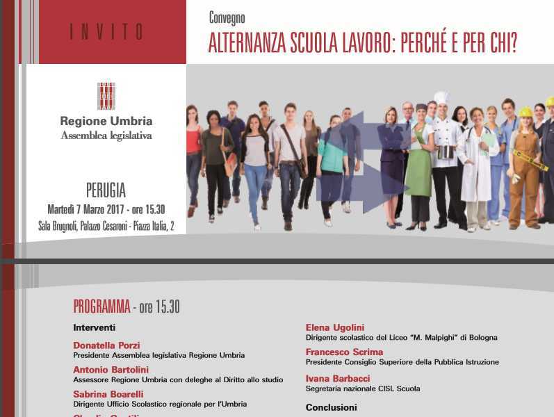 (Acs) Perugia, 6 marzo 2017 - “Alternanza scuola lavoro: Perché e per chi?”. È il titolo di un convegno organizzato dall'Assemblea legislativa dell'Umbria che avrà luogo a Palazzo Cesaroni (Sala Brugnoli) per domani, martedì 7 marzo alle ore 15.30.