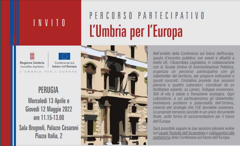 (Acs) Perugia, 13 aprile 2022 – Con l’obiettivo di qualificare l'Umbria in ambito europeo, favorire la conoscenza delle opportunità che l'UE offre e contribuire, in ottica collaborativa e partecipativa, a migliorare la ripresa economica e sociale post pandemia, l'Assemblea legislativa, in collaborazione con la Scuola Umbra di Amministrazione pubblica, ha ritenuto opportuno realizzare un percorso partecipativo con gli stakeholder del territorio. Si tratta della Conferenza sul futuro dell'Europa, uno spazio di incontro pubblico con eventi e dibattiti da cui deriverà la formulazione di raccomandazioni a cui l'Unione dovrà dare seguito.