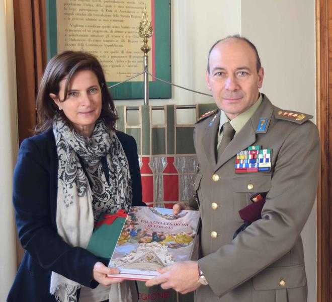 (Acs) Perugia, 4 febbraio 2016 – La presidente dell'Assemblea legislativa dell'Umbria, Donatella Porzi, ha ricevuto stamani a Palazzo Cesaroni il nuovo comandante del Comando Militare Esercito 'Umbria', Colonnello Riccardo Caimmi, che ha assunto l’incarico lo scorso mese di dicembre.