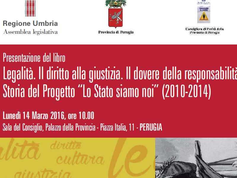 (Acs) Perugia, 11 marzo 2016 - La presidente dell'Assemblea legislativa dell'Umbria, Donatella Porzi, lunedì 14 marzo, alle ore 10, a Perugia, nella Sala del Consiglio provinciale (piazza Italia 11) parteciperà alla presentazione del volume “Legalità. Il diritto alla giustizia. Il dovere della responsabilità”, curato da Maurizio Terzetti. All'incontro prenderanno parte, il presidente della Provincia di Perugia, Nando Mismetti, il vicepresidente dell'Assemblea legislativa Marco Vinicio Guasticchi, il sottosegretario agli Interni, Gianpiero Bocci, il procuratore generale della Repubblica di Perugia, Fausto Cardella, Gemma Paola Bracco, consigliera di parità della provincia di Perugia, Fabrizio Stazi Segretario generale della Fondazione Cassa di Risparmio di Perugia. RED/