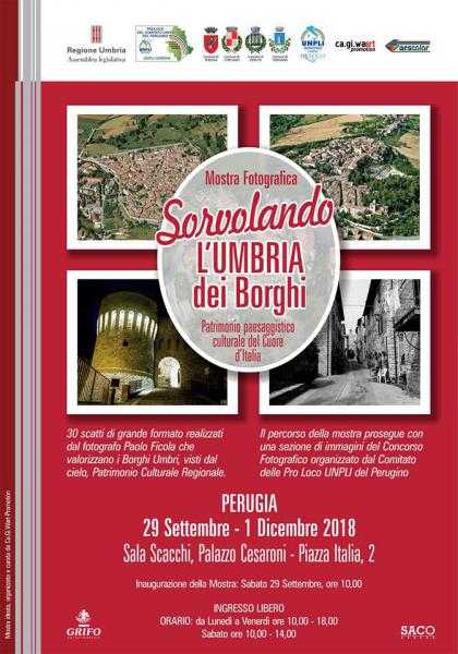 (Acs) Perugia, 28 settembre 2018 - Sarà inaugurata domani, sabato 29 settembre, alle ore 10 nella sala Brugnoli di Palazzo Cesaroni di Perugia, la mostra fotografica "Sorvolando l'Umbria dei borghi" che, attraverso gli scatti di grande formato realizzati dal fotografo Paolo Ficola, intende valorizzare i borghi umbri in una prospettiva inedita: visti dal cielo. Il percorso della mostra contiene anche una sezione di immagini del concorso fotografico organizzato dal Comitato delle Pro loco Unpli del perugino, unitamente ai Comuni di Perugia, Corciano, Deruta, Torgiano in collaborazione con l’Assemblea Legislativa dell’Umbria, l’Associazione CaGiWart-Promotion e Arscolor . La mostra sarà visitabile, con ingresso libero, dal lunedì al venerdì dalle ore 10 alle ore 18, il sabato dalle 10 alle 14, fino al 1 dicembre 2018.