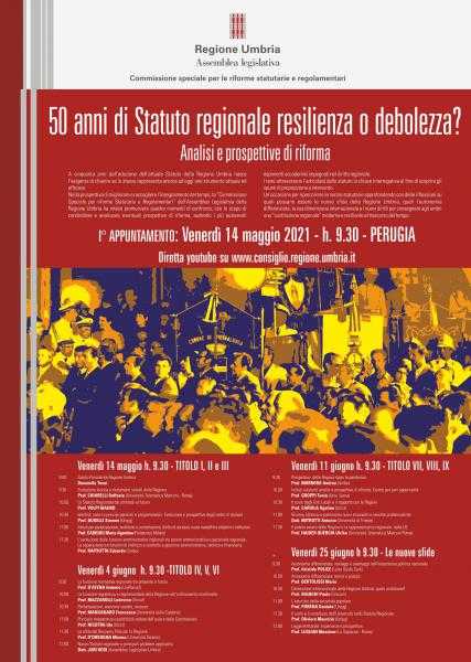RELATORI: Raffaele CHIARELLI (Università telematica ‘Marconi’ - Roma) ‘Evoluzione storica e mutamenti sociali della Regione’; Mauro VOLPI (Università di Perugia) ‘Lo Statuto regionale dai primordi al futuro’; Simone BUDELLI (Università di Perugia) ‘Identità, valori e principi generali e programmatici. Evoluzione e prospettive degli umbri di domani’; Maria Agostina CABIDDU (Politecnico Milano) ‘Istituti per partecipazione, audizione e concertazione, diritto di accesso, nuovi modelli tra cittadini e istituzioni; Edoardo RAFFIOTTA (Università di Bologna) ‘L’evoluzione delle funzioni amministrative regionali tra azione amministrativa e personale regionale. La separazione tra funzioni di indirizzo e controllo e gestione amministrativa, tecnica e finanziaria’.