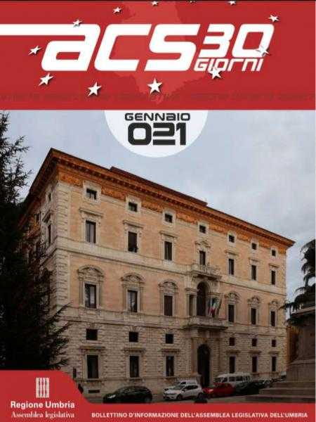 (Acs) Perugia, 10 febbraio 2021 – Tutta l'attività di informazione istituzionale prodotta dall'Ufficio stampa dell'Assemblea legislativa dell'Umbria a gennaio 2021, attraverso l'Agenzia Acs, è disponibile nel mensile online “Acs 30 giorni”. La pubblicazione, in formato pdf, può essere sfogliata e scaricata all'indirizzo: tinyurl.com/54uo94zs
