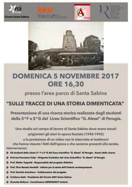(Acs) Perugia, 3 novembre 2017 - “Sulle tracce di una storia dimenticata” è il titolo dello spettacolo teatrale, curato dalle classi V° F e V° G del Liceo scientifico “Galeazzo Alessi” di Perugia, che andrà in scena domenica 5 novembre, alle ore 16.30, nei locali della Coccinella, presso l’Area parco di Santa Sabina (Perugia).