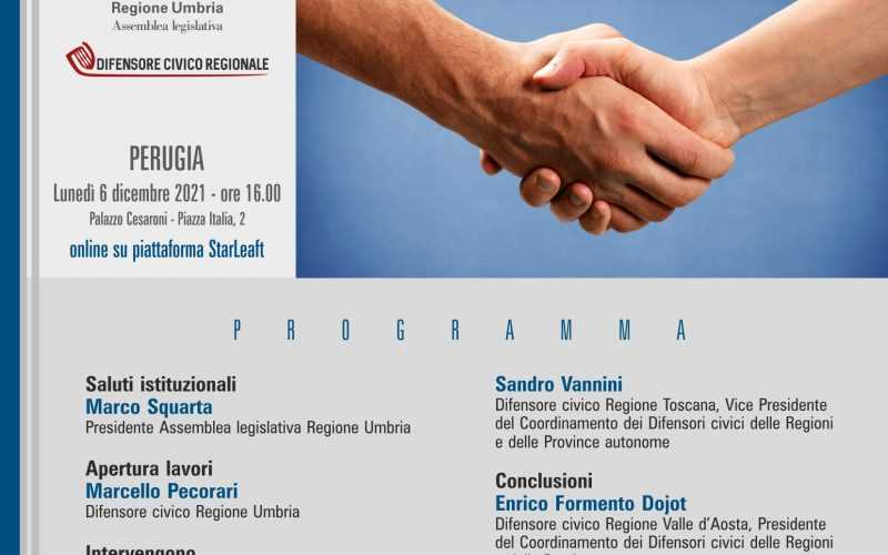 (Acs) Perugia, 2 dicembre 2021 - Lunedì 6 dicembre, alle ore 16, si terrà un incontro pubblico sul tema “La difesa civica e i rapporti con i cittadini. Esperienze a confronto” che si svolgerà su piattaforma Starleaft e che verrà trasmesso in diretta streaming sul canale youtube dell’Assemblea legislativa della Regione Umbria.