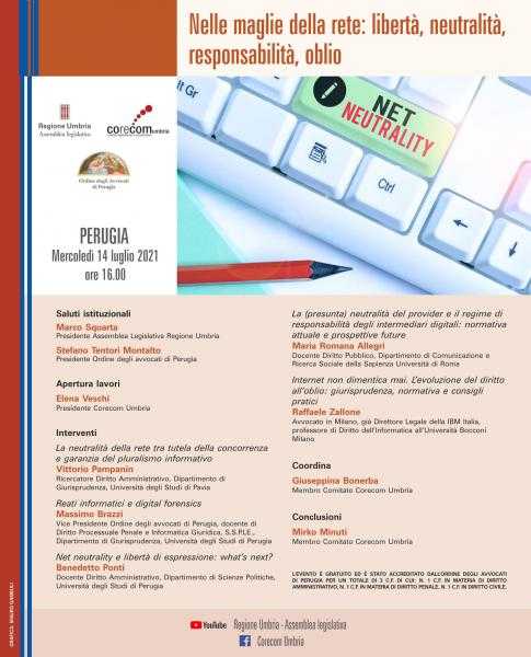 Aprirà i lavori la presidente del Corecom Umbria, Elena VESCHI a cui seguiranno gli interventi di: Vittorio PAMPANIN (ricercatore diritto amministrativo-Università di Perugia) “La neutralità della rete tra tutela della concorrenza e garanzia del pluralismo informativo”; Massimo BRAZZI (vicepresidente Ordine avvocati Perugia-docente Università di Perugia) “Reati informatici e digital forensics”; Benedetto PONTI (Docente Università di Perugia) “Net neutrality e libertà di espressione: what’s next?”; Maria Romana ALLEGRI (docente Università ‘Sapienza’ di Roma) “La (presunta) neutralità del provider e il regime di responsabilità degli intermediari digitali: normativa attuale e prospettive future”; Raffaele ZALLONE (avvocato-docente Università ‘Bocconi’ di Milano) “Internet non dimentica mai. L’evoluzione del diritto all’oblio: giurisprudenza, normativa e consigli pratici”.