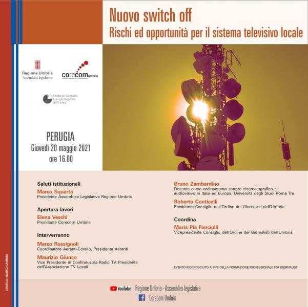 “NUOVO SWITCH OFF. RISCHI ED OPPORTUNITÀ PER IL SISTEMA TELEVISIVO LOCALE” - OGGI A PALAZZO CESARONI IL SEMINARIO ONLINE PROMOSSO DAL CORECOM DELL’UMBRIA