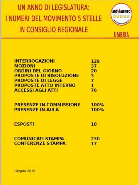 (Acs) Perugia, 25 giugno 2016 - 129 interrogazioni a 37 mozioni, 20 ordini del giorno, 3 risoluzioni, 7 proposte di legge, 76 richieste di accesso agli atti. Presenze ai lavori di Commissione sono state del 100 percento, così come quelle ai lavori d'Aula. 18 gli esposti presentati alla Magistratura. Sono questi i numeri del primo anno di attività del gruppo consiliare regionale del Movimento 5 Stelle, presentati questa mattina a Palazzo Cesaroni dai consiglieri regionali Andrea Liberati e Maria Grazia Carbonari.