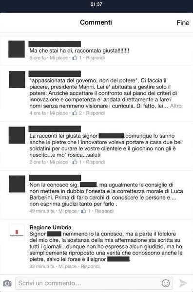 Luca Barberini ricostruisce così quanto avvenuto sul social network. “Nel dibattito che ha coinvolto vari utenti un cittadino ha affermato: 'La racconti lei giusta signor …. comunque lo sanno anche le pietre che l'innovatore voleva portare a casa due bei soldatini per curare le vostre clientele e il giochino non gli è riuscito... E mo' rosica….'. Un altro utente ha replicato: 'Non la conosco sig... ma ugualmente le consiglio di non mettere in dubbio l'onestà e la correttezza morale di Luca Barberini. Prima di farlo cerchi di conoscere le persone e ... Non esprima giudizi tanto per farlo'. Prontissima è stata la risposta del presunto profilo ufficiale della Regione Umbria: 'Signor .... nemmeno io la conosco, ma a parte il folclore del mio dire, la sostanza della mia affermazione sta scritta su tutti i giornali ... dunque non ho espresso alcun giudizio, ma ho semplicemente riproposto una verità che conoscono anche le pietre, salvo forse lei signor..'. “A quale verità – si chiede Barberini - si riferisce la 'Regione Umbria'? Esiste una verità assoluta di cui è depositaria? E perché parla in prima persona? E ancora: perché utilizza parole simili ('lo sanno anche le pietre') all'utente che aveva attaccato il mio operato?”