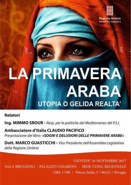 (Acs) Perugia, 15 novembre 2017 - Le problematiche geo-politiche ed economiche nell'area del Mediterraneo derivanti dalle crisi del Medio-Oriente sono al centro di una serie di conferenze pubbliche organizzate dal vicepresidente Marco Vinicio Guasticchi, con il patrocinio dell'Assemblea legislativa dell'Umbria. La seconda delle tre iniziative programmate (la prima si è svolta il 3 novembre scorso: https://goo.gl/87rH6m ) si svolgerà domani, 16 novembre, a Perugia, nella Sala Brugnoli di Palazzo Cesaroni, alle ore 17. Sul tema : “La primavera araba” (“utopia o gelida realtà”). Si confronteranno Mimmo Srour-responsabile per le politiche del Mediterraneo del Psi-; Claudio Pacifico-ex ambasciatore della Repubblica italiana che presenterà il suo libro “Sogni e diffusioni delle Primavere arabe”; Marco Vinicio Guasticchi-vicepresidente dell'Assemblea legislativa dell'Umbria.