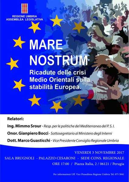 (Acs) Perugia, 3 novembre 2017 - Le problematiche geo-politiche ed economiche nell'area del Mediterraneo derivanti dalle crisi del Medio-Oriente saranno al centro di una serie di conferenze pubbliche organizzate dal vicepresidente Marco Vinicio Guasticchi, con il patrocinio dell'Assemblea legislativa dell'Umbria.