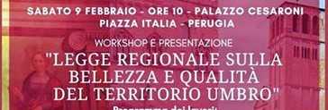 (Acs) Perugia, 9 febbraio 2019 – La ‘Legge regionale sulla bellezza e la qualità del territorio umbro’ verrà presentata questa mattina, a Perugia, nella Sala Brugnoli di Palazzo Cesaroni, alle ore 10. L’iniziativa è promossa e organizzata dal consigliere regionale del Partito Democratico Giacomo Leonelli, primo firmatario della proposta di legge. I lavori saranno introdotti dal saluto della presidente dell’Assemblea Legislativa, Donatella Porzi.