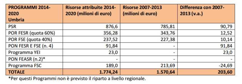 LE RISORSE COMUNITARIE. Per la programmazione comunitaria 2014-2020 la Regione Umbria potrà disporre di risorse per 1 miliardo 774 milioni di euro, tra Programma nazionale di sviluppo rurale (876 milioni), Fondo europeo di sviluppo regionale (Fesr, 356 milioni), Fondo sociale europeo (Fse, 237 milioni), Fondo europeo per l’agricoltura e lo sviluppo rurale (Feasr), Programma Youth Employment Initiative (Yei, 23 milioni), Fondo di sviluppo e coesione (Fsc, 189 milioni) (tabella: http://goo.gl/medm2A).