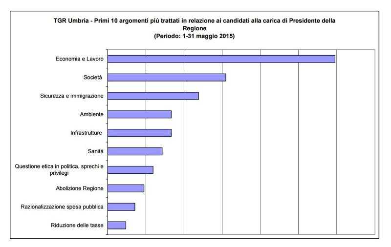I TEMI PIÙ TRATTATI: “Ripresa economica e lavoro in primis, seguiti da questioni sociali (lotta alla povertà, sostegno alle famiglie, reddito di cittadinanza). Nel TGR Rai emergono poi i temi relativi a sicurezza e immigrazione e all'ambiente; nei programmi, invece, in terza posizione si colloca il tema della sanità. Il candidato del centrosinistra si è più concentrato sui temi dell'economia e del lavoro. Il candidato del centrodestra invece sulla razionalizzazione della macchina pubblica, sul rilancio dell'economia e sulle infrastrutture. Il Movimento Cinque Stelle ha cavalcato la questione dell'etica in politica e, in minor misura, le problematiche ambientali. Sicurezza e immigrazione sono state completo appannaggio dei due candidati presidente delle forze di destra, 'Sovranità Prima gli italiani' e 'Forza Nuova' (e della Lega, facente parte della coalizione a sostegno di Claudio Ricci). Le questioni sociali sono state un argomento abbastanza trasversale tra tutti i competitors”.