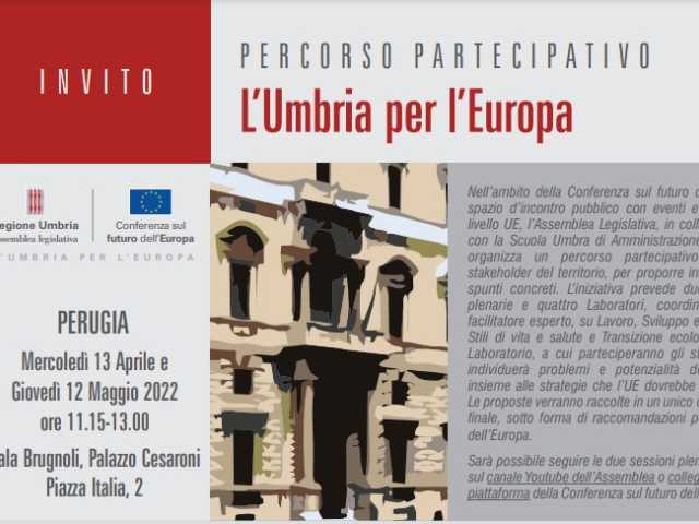 Data13 Aprile 2022ASSEMBLEA LEGISLATIVA: “CONFERENZA SUL FUTURO DELL'EUROPA” - OGGI MERCOLEDÌ 13 APRILE, ORE 11.15 A PALAZZO CESARONI PRIMA PLENARIA. OBIETTIVO: QUALIFICARE L'UMBRIA IN AMBITO EUROPEO