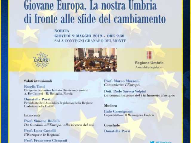 Data8 Maggio 2019CALRE: “GIOVANE EUROPA. LA NOSTRA UMBRIA DI FRONTE ALLE SFIDE DEL CAMBIAMENTO” - GIOVEDÌ 9 MAGGIO ORE 9.30 A NORCIA PROSEGUONO LE GIORNATE DI CONFRONTO CON GLI STUDENTI